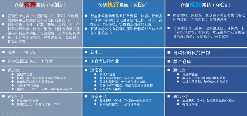 倉庫(ku)執行系(xi)統(WES)包含了倉庫(ku)管(guan)(guan)(guan)(guan)(guan)(guan)(guan)(guan)理(li)(li)(li)(li)系(xi)統(WMS)的(de)(de)部分功(gong)能(neng)(neng)。倉庫(ku)執行系(xi)統(WES)可以被認為是(shi)下(xia)一代倉庫(ku)控(kong)制(zhi)系(xi)統(WCS)。從(cong)這個(ge)角(jiao)度說,它(ta)提(ti)供(gong)了與(yu)倉庫(ku)控(kong)制(zhi)系(xi)統(WCS)相同的(de)(de)功(gong)能(neng)(neng),而且在此基(ji)礎(chu)上(shang)構(gou)建更(geng)高級別的(de)(de)倉庫(ku)管(guan)(guan)(guan)(guan)(guan)(guan)(guan)(guan)理(li)(li)(li)(li)體系(xi),具(ju)體功(gong)能(neng)(neng)如(ru)下(xia):訂單管(guan)(guan)(guan)(guan)(guan)(guan)(guan)(guan)理(li)(li)(li)(li)丨(shu)(shu)波次管(guan)(guan)(guan)(guan)(guan)(guan)(guan)(guan)理(li)(li)(li)(li)丨(shu)(shu)庫(ku)位庫(ku)存(cun)管(guan)(guan)(guan)(guan)(guan)(guan)(guan)(guan)理(li)(li)(li)(li)丨(shu)(shu)艙單管(guan)(guan)(guan)(guan)(guan)(guan)(guan)(guan)理(li)(li)(li)(li)丨(shu)(shu)商(shang)業智能(neng)(neng)丨(shu)(shu)射頻掃描儀集(ji)(ji)成丨(shu)(shu)語音(yin)集(ji)(ji)成丨(shu)(shu)手(shou)動揀(jian)選丨(shu)(shu)補貨(huo)(huo)管(guan)(guan)(guan)(guan)(guan)(guan)(guan)(guan)理(li)(li)(li)(li)丨(shu)(shu)自(zi)動化揀(jian)選管(guan)(guan)(guan)(guan)(guan)(guan)(guan)(guan)理(li)(li)(li)(li)丨(shu)(shu)領料標簽(qian)管(guan)(guan)(guan)(guan)(guan)(guan)(guan)(guan)理(li)(li)(li)(li)丨(shu)(shu)燈光(guang)揀(jian)貨(huo)(huo)管(guan)(guan)(guan)(guan)(guan)(guan)(guan)(guan)理(li)(li)(li)(li)丨(shu)(shu)系(xi)統路由管(guan)(guan)(guan)(guan)(guan)(guan)(guan)(guan)理(li)(li)(li)(li)丨(shu)(shu)質量管(guan)(guan)(guan)(guan)(guan)(guan)(guan)(guan)理(li)(li)(li)(li)丨(shu)(shu)包裝站管(guan)(guan)(guan)(guan)(guan)(guan)(guan)(guan)理(li)(li)(li)(li)丨(shu)(shu)打(da)印管(guan)(guan)(guan)(guan)(guan)(guan)(guan)(guan)理(li)(li)(li)(li),與(yu) WCS 不一樣的(de)(de)地方(fang)是(shi),WES 的(de)(de)功(gong)能(neng)(neng)可以與(yu) WMS 的(de)(de)功(gong)能(neng)(neng)重疊,具(ju)體包括:月(yue)臺管(guan)(guan)(guan)(guan)(guan)(guan)(guan)(guan)理(li)(li)(li)(li)丨(shu)(shu)收(shou)貨(huo)(huo)管(guan)(guan)(guan)(guan)(guan)(guan)(guan)(guan)理(li)(li)(li)(li)丨(shu)(shu)質檢管(guan)(guan)(guan)(guan)(guan)(guan)(guan)(guan)理(li)(li)(li)(li)丨(shu)(shu)上(shang)架管(guan)(guan)(guan)(guan)(guan)(guan)(guan)(guan)理(li)(li)(li)(li)丨(shu)(shu)揀(jian)貨(huo)(huo)管(guan)(guan)(guan)(guan)(guan)(guan)(guan)(guan)理(li)(li)(li)(li)丨(shu)(shu)打(da)包管(guan)(guan)(guan)(guan)(guan)(guan)(guan)(guan)理(li)(li)(li)(li)丨(shu)(shu)發貨(huo)(huo)管(guan)(guan)(guan)(guan)(guan)(guan)(guan)(guan)理(li)(li)(li)(li)丨(shu)(shu)勞務管(guan)(guan)(guan)(guan)(guan)(guan)(guan)(guan)理(li)(li)(li)(li)。